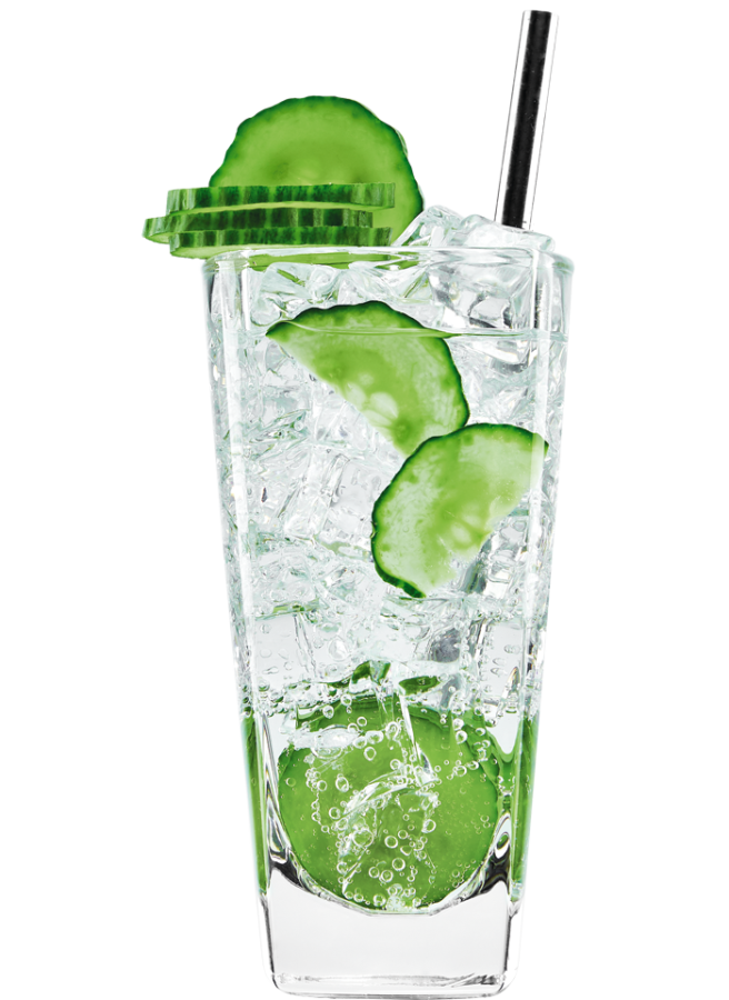Put all the ingredients into a glass with ice, add the cucumber slices and serve with a straw and a stirrer.