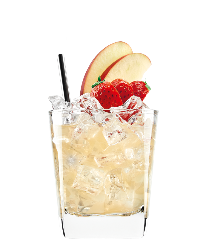 In a glass, mash the strawberries, add ice, pour all the ingredients and stir; serve with a straw and garnish with one strawberry on top.